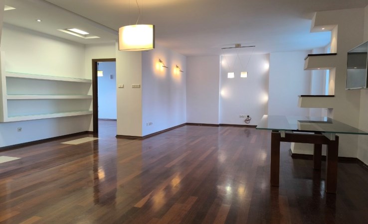 Apartament został urządzony przez architekta z najwyższej jakości materiałów, i oferuje panoramiczny widok na warszawskie wieżowce, w tym Warsaw Spire.